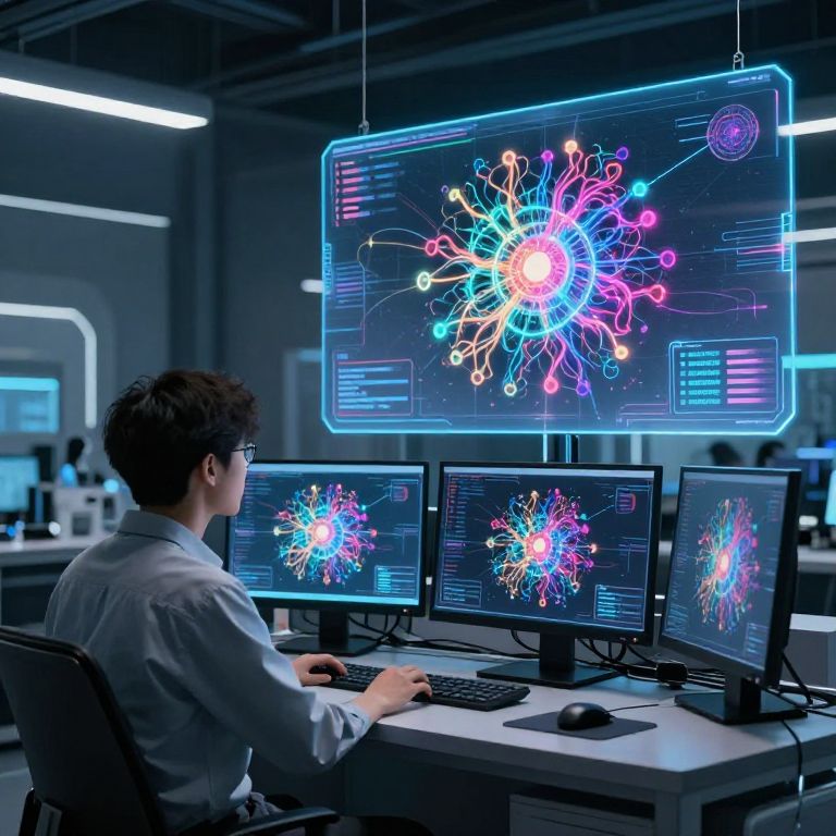 Photograph of a man in a lab coat, seated at a desk, working on four monitors displaying a vivid, colorful molecular network diagram suspended above.