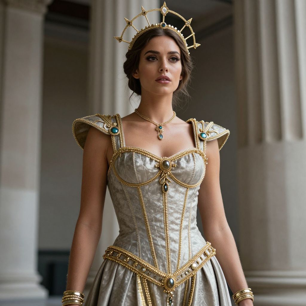 Photograph of a dark-haired woman with a regal, fair complexion, wearing an elaborate, metallic silver gown adorned with gold trim and green gemstones. She has a golden, crown-like headpiece with intricate patterns. Her gown features puffed, gold-embellished shoulders and a fitted bodice with a jewel at the center. She wears a matching necklace and several gold bracelets. The background shows tall, white columns, suggesting a grand, classical architecture. Her expression is poised and confident, and she stands centered in the frame.