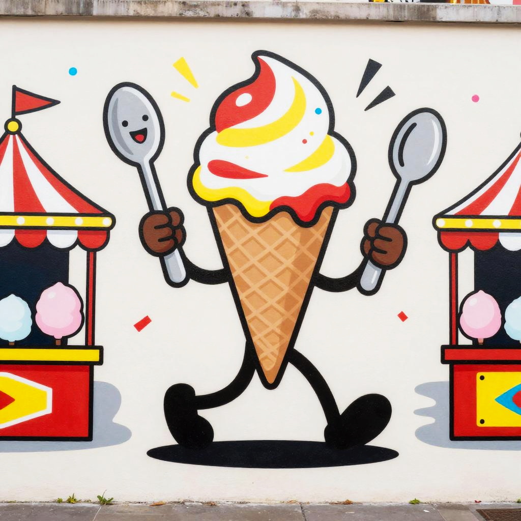 Haring-esque stick figure clapping enthusiastically holding hands with smiling suns and lively dancing flames, thick black outlines, bright candy red and lemon yellow accents, joyful motion and expressive gestures, playful pop-art minimalism, confetti dots, clean negative space, crisp edges, high contrast; set against open-air market scene with brightly painted stalls and hanging lanterns; urban energy, celebratory rhythm, vibrant, dynamic, graphic, mural-like presentation