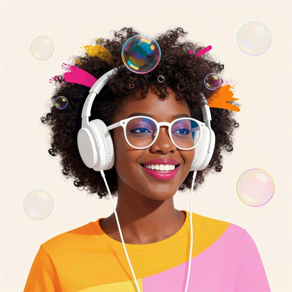 The image is a vibrant and colorful poster featuring an African woman with an afro hairstyle adorned with bubbles. She is wearing large, white headphones and stylish glasses, exuding a sense of happiness and contentment. The background is a minimalist, flat light color palette, allowing the vivid colors of the woman's hair and the bubbles to stand out prominently. The bubbles are scattered throughout the image, adding a playful and dynamic element to the composition. The overall arrangement is balanced, with the woman centrally positioned, and the bubbles creating a sense of movement and energy around her. The use of bright, contrasting colors and the interplay of shapes and textures contribute to a visually engaging and harmonious image.