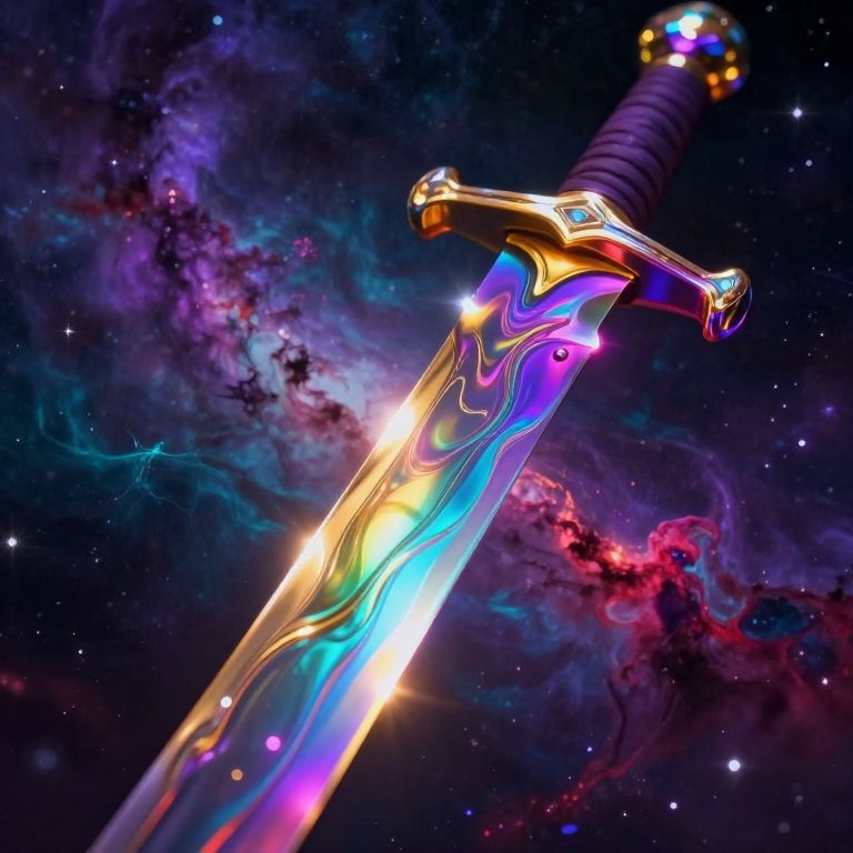 Focus: Close-up shot, sword made entirely of swirling liquid rainbows, Material: Reflective surface, iridescent hues shifting—violet, gold, cyan, magenta, Details: Blade rippling like water, glowing edges, light refractions creating prismatic sparks, Background: Deep cosmic space, nebulae swirling in purple, teal, and crimson; scattered stars shimmering, Lighting: Sword radiating faint multicolored glow, casting reflections onto the cosmic void, Angle: Slight upward tilt, sword dominating the frame with dynamic perspective, Mood: Mystical, powerful, surreal beauty
