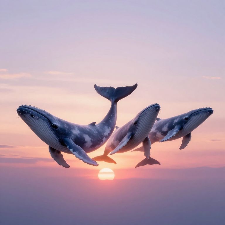 A quartet of sleek, ethereal whales gracefully swims through a luminous, otherworldly sky, their silhouettes bathed in the soft glow of a surreal sunset that defies the boundaries between sea and sky.