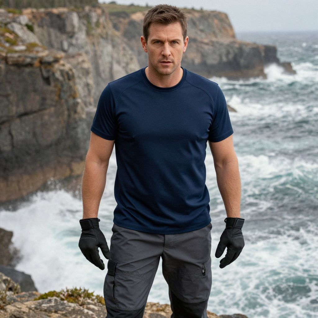 Photograph of a muscular man with short brown hair, wearing a navy t-shirt, black gloves, and gray pants, standing on rocky cliffs with crashing