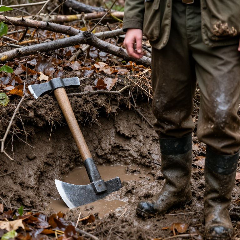 Photograph of a person standing in a muddy forest, wearing dark green, muddy pants and black boots. The person's hand, partially visible, rests on a dirt bank. A wooden-handled axe with a metal head is lodged in the muddy ground beside the person. The background includes fallen leaves, twigs, and more mud, creating a natural, earthy setting. The colors are predominantly brown and green, with the axe's metal head adding a reflective, silver contrast. The image has a realistic, detailed style.