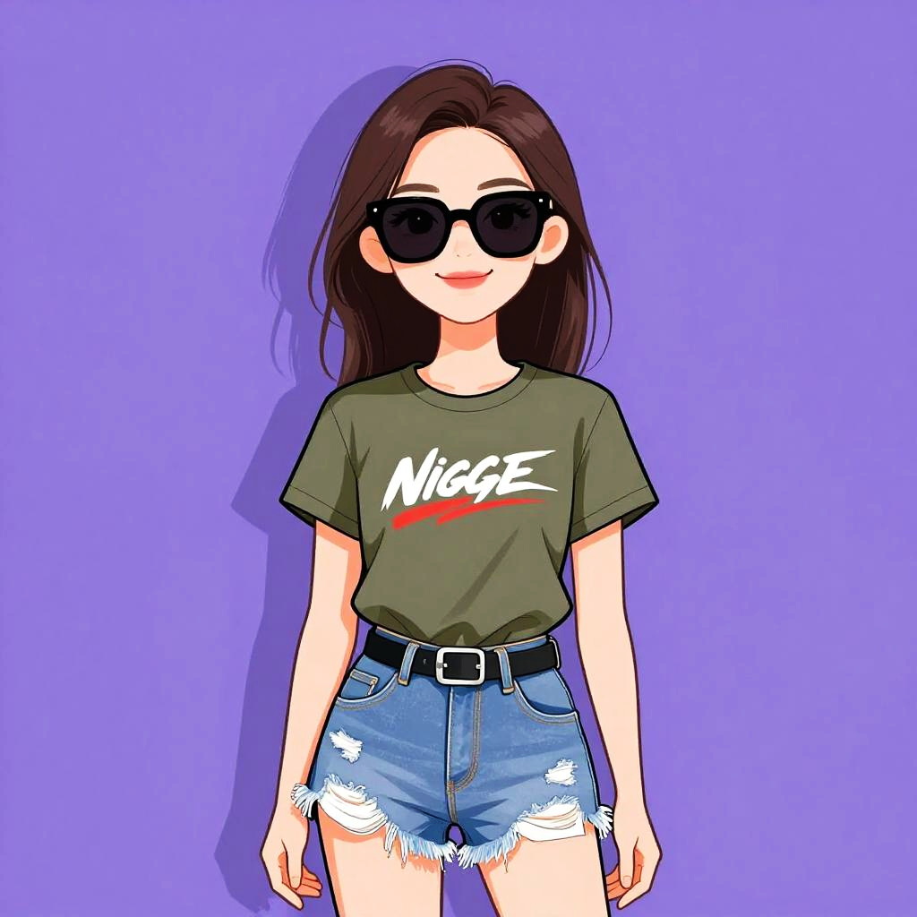 This digital anime-style drawing features a young woman with long, dark brown hair and fair skin, standing against a solid purple background. She is wearing black sunglasses, a green T-shirt with the word "NICE" in white and red lettering, and high-waisted, frayed denim shorts with a black belt. Her expression is neutral, and she has a slight, confident smile. The artwork uses bold, clean lines and vibrant colors, typical of modern digital anime illustrations. The lighting casts a subtle shadow to the left, adding depth to the image.