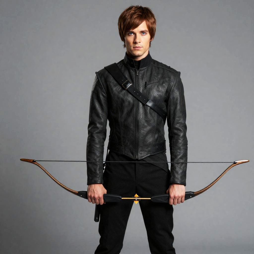 Hunger Games Costume Peeta, man in a black and grey outfit holding a bow and arrow