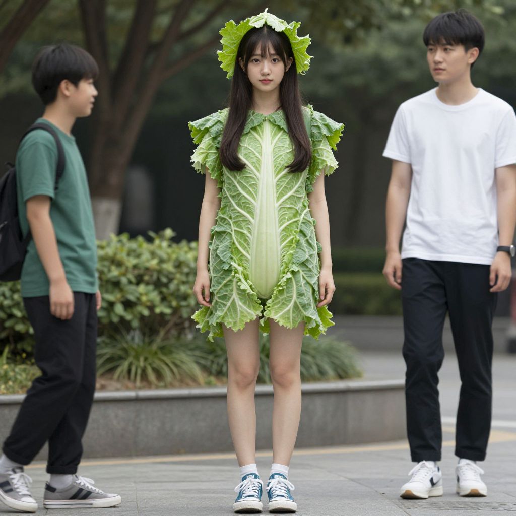 "cabbages costume, solo, shoes, full body, standing, 1girl, leaf, 1boy, male focus, sneakers, plant Realistic photo of casual sexy person with pretty face"