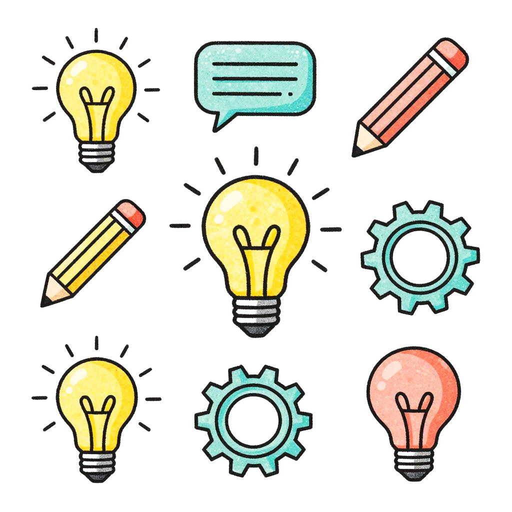 Prompt clipart showing a diverse set of hand-drawn style illustrations including light bulbs, pencils, speech bubbles, and gears, symbolizing brainstorming and innovation, rendered in bright pastel colors with a playful and modern aesthetic.