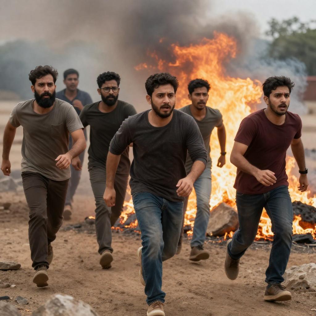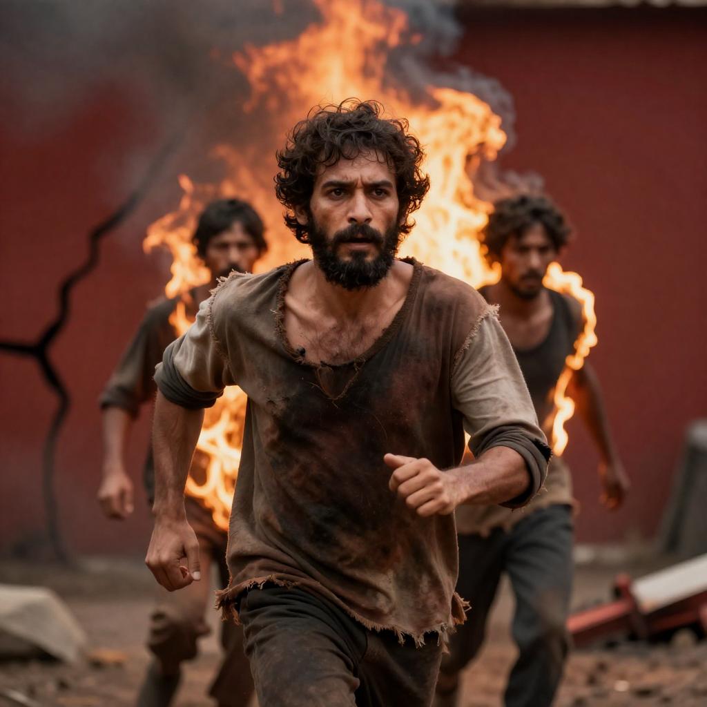 Action photograph of a man in a gray shirt and black jacket, running while sparks fly from an exploded vehicle in a dimly lit street. Another man with a cigarette stands on the vehicle. Buildings and debris in the background.