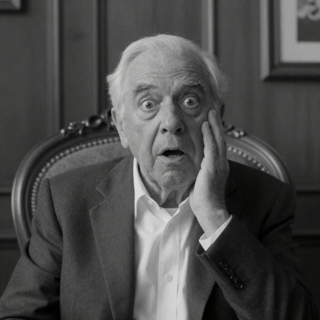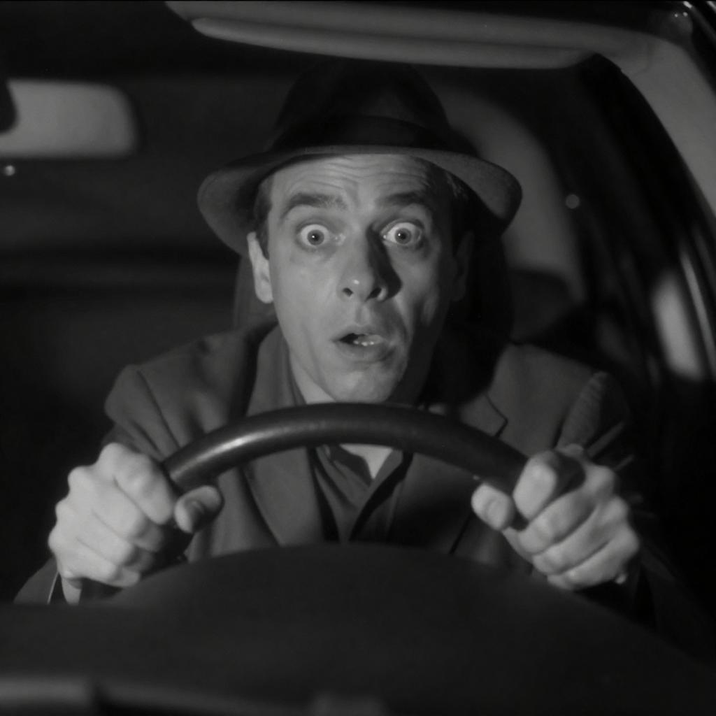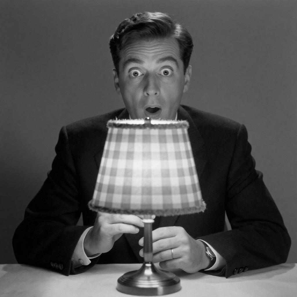 Black-and-white photograph of a surprised man in a dark suit holding a checkered lampshade. His wide eyes and open mouth are prominent. Lamp on a table with a cloth and a few objects. Man in the foreground, lamp in the center.