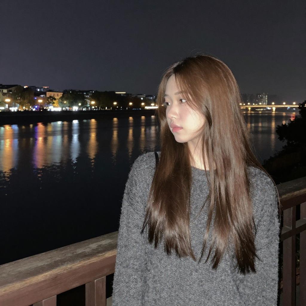 Photograph of a young woman with long, straight brown hair and fair skin, wearing a gray, textured sweater. She stands on a wooden railing at night, gazing to the right with a pensive expression. The background features a calm, dark river reflecting city lights and buildings. The sky is dark blue, and the lights create a colorful reflection on the water. The woman's hair has a slight shine, and her face is softly illuminated by the ambient light. The overall mood is contemplative and serene.