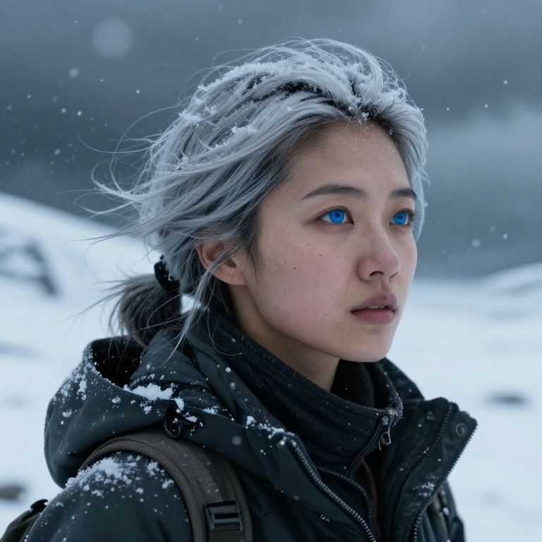 Envision an enigmatic East Asian explorer with piercing blue eyes and rugged features honed by years in the wild, their silver hair flowing yet tied back in a practical ponytail. Captured from a unique 'bug's-eye view' perspective against a stormy Arctic backdrop, soft natural light filters through swirling snowflakes that dance around her face. This portrait evokes awe at the explorer's resilience and determination while contemplating nature's untamed beauty. The blend of hyperrealism and evocative chiaroscuro lighting creates an unforgettable representation of humanity's connection to its environment.
