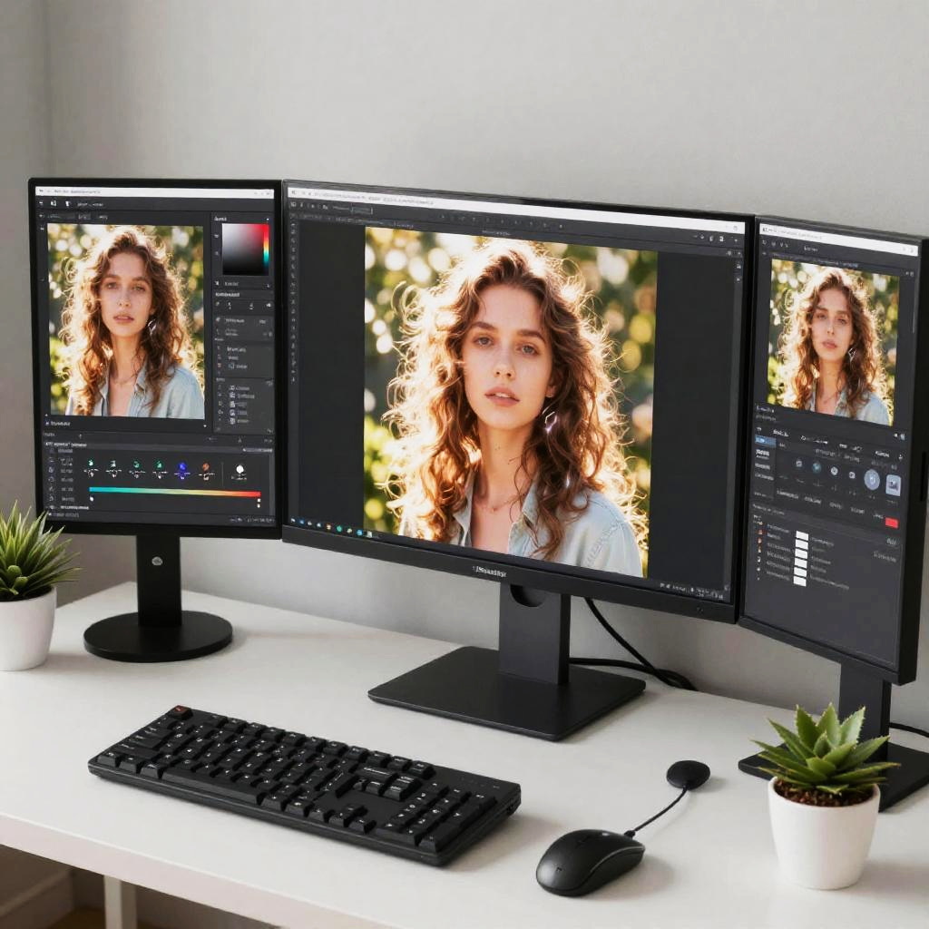 A professional photo editing workspace with multiple monitors showing the step-by-step lens flare removal process on a portrait shot under bright sunlight, focusing on the clean and natural light effects post-edit, digital art style.