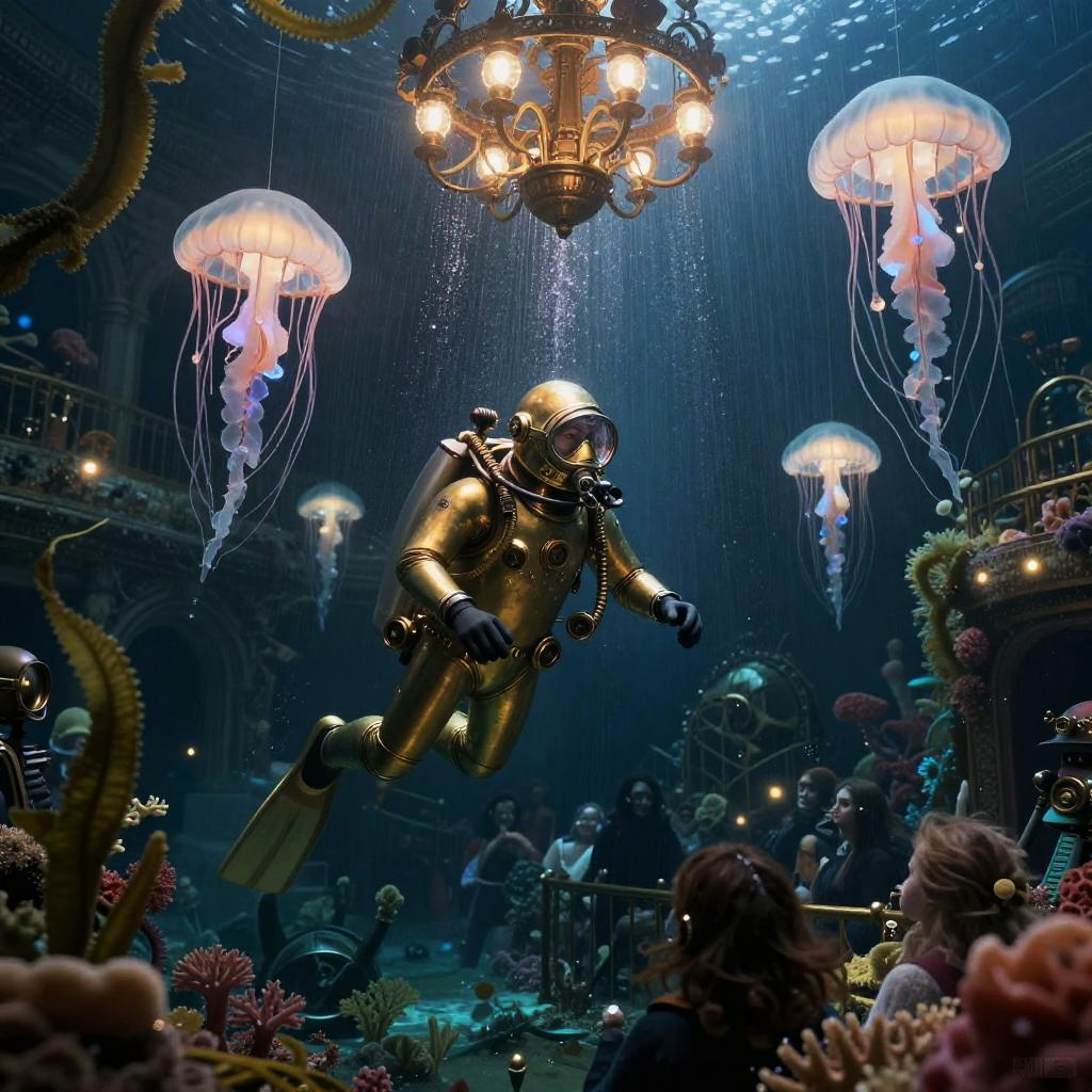 Clockwork deep-sea conductor in a brass diving suit in sunken opera house draped in kelp and coral, as a chandelier of phosphorescent jellyfish unleashing curtains of bioluminescent droplets that pour like luminous rain over the audience pours radiant lights like rain on the crowd, creating a nostalgic, haunting, and otherworldly atmosphere. Captured in steampunk hyperreal photography, this scene showcases reviving a lost symphony for the ghosts of the sea with ultra-detailed portraits, Seed 314159 ar.