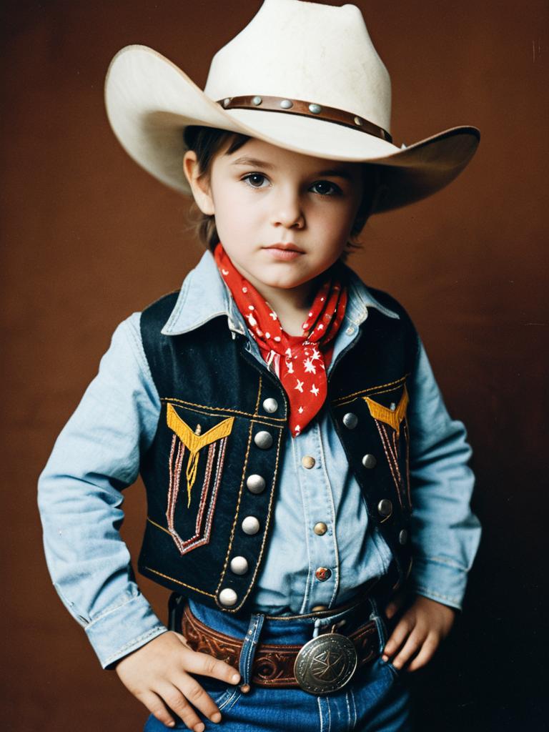 Child in Cowboy Costume, waist-up editorial portrait, photorealistic tones