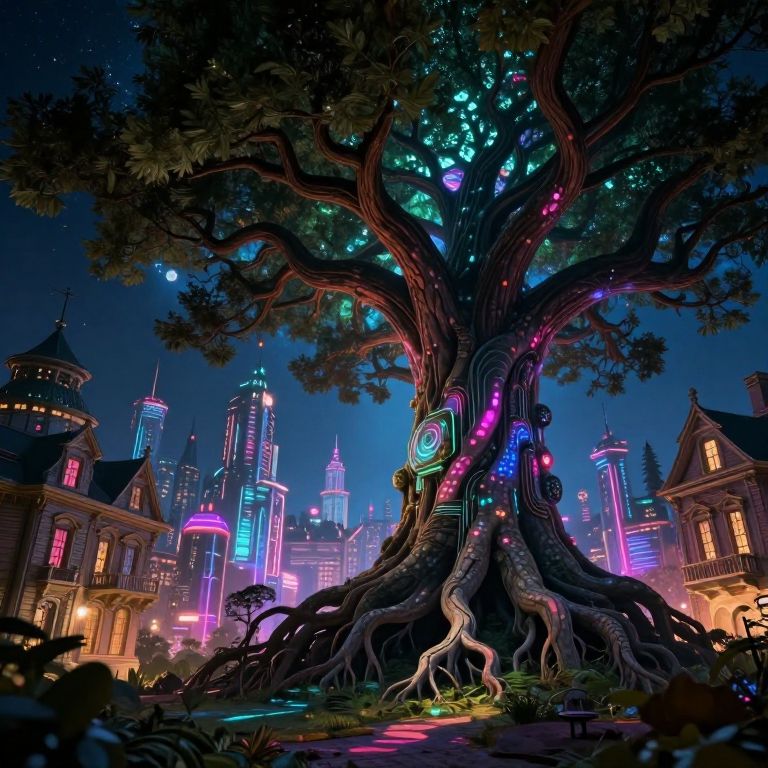 Visualize a surreal landscape where an enormous, ancient tree with intertwining branches stretches towards a celestial night sky. From its gnarled roots, a thriving cybernetic city arises, seamlessly merging Victorian architecture with advanced technology. The scene is bathed in vibrant neon lights and holographic projections that cast kaleidoscopic reflections on the metallic surfaces, generating an enchanting ambiance of intrigue and amazement. As the tree's elongated shadows dance across the scene, viewers are enticed to delve into this captivating amalgamation of nature, art, and science fiction, evoking a profound sense of wonder and curiosity as they traverse through this mesmerizing visual odyssey.