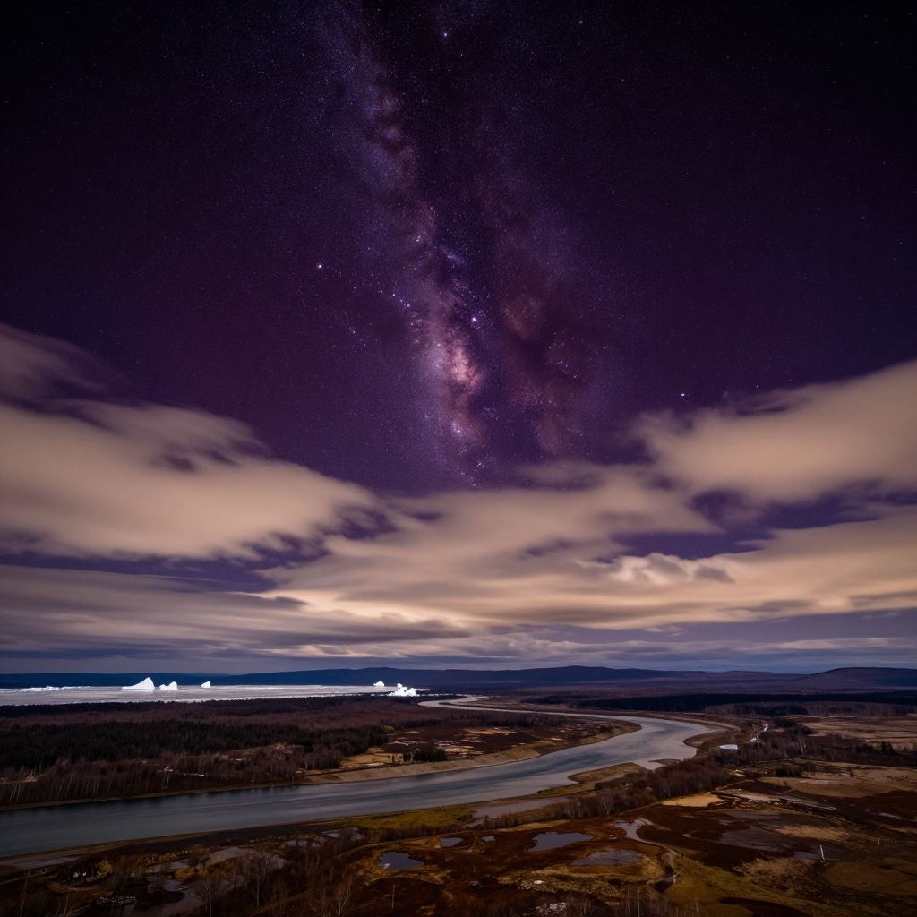 <8k, high detail, uhd, sharp focus, palette, photorealistic, absurdres, extreme detail, as much detail as possible>, a mesmerizing scenery of clouds and stars showing a natural landscape, celestial objects in a beautiful sky, rivers, beautiful earth, ice, coastline, trees, wetland, iceberg, night, the most beautiful image in the world, dark indigo, shiny purple, shiny maroon, dark beige