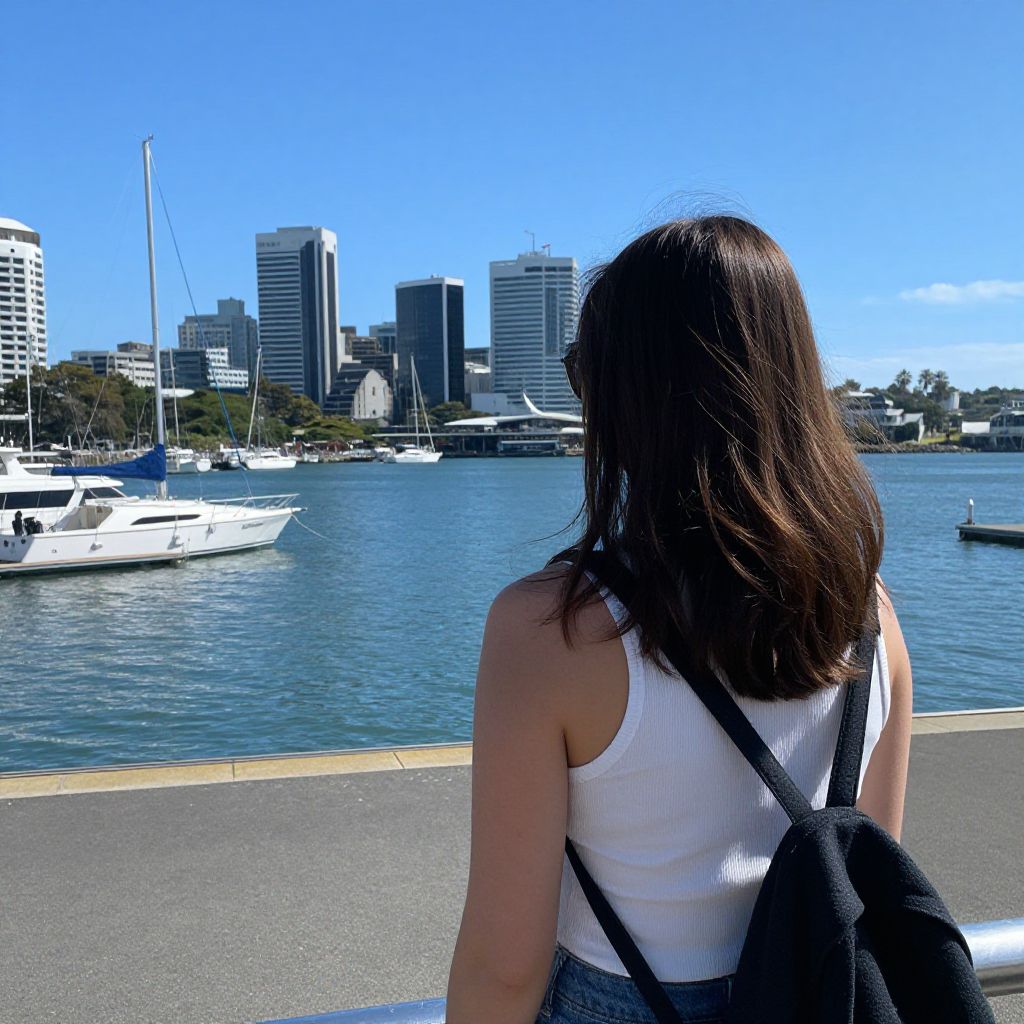 Woman enjoying a sunny day by the waterfront in Newcastle, New South Wales, with boats docked in the harbor and a scenic cityscape in the background.