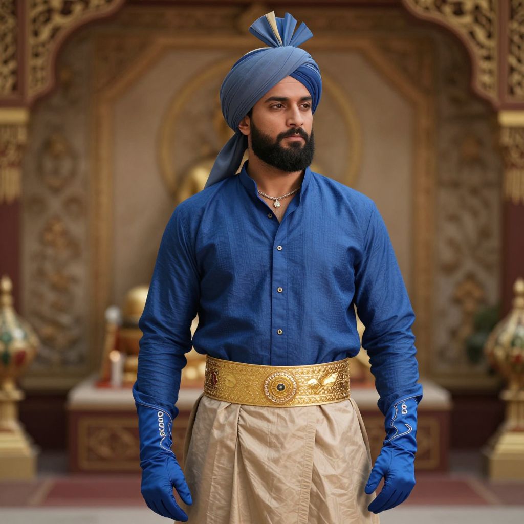 A handsome man with a flowing turban, wearing a stylish blue shirt, beige traditional outfit, gold belt, a prominent beard, a delicate necklace, and elegant blue gloves is depicted in a serene traditional cultural setting. The scene radiates modesty, elegance, and rich cultural heritage, with soft lighting and intricate background details that highlight the craftsmanship and spiritual atmosphere of the environment. The man stands confidently, embodying wisdom and grace, in a setting that reflects deep-rooted customs and heritage.