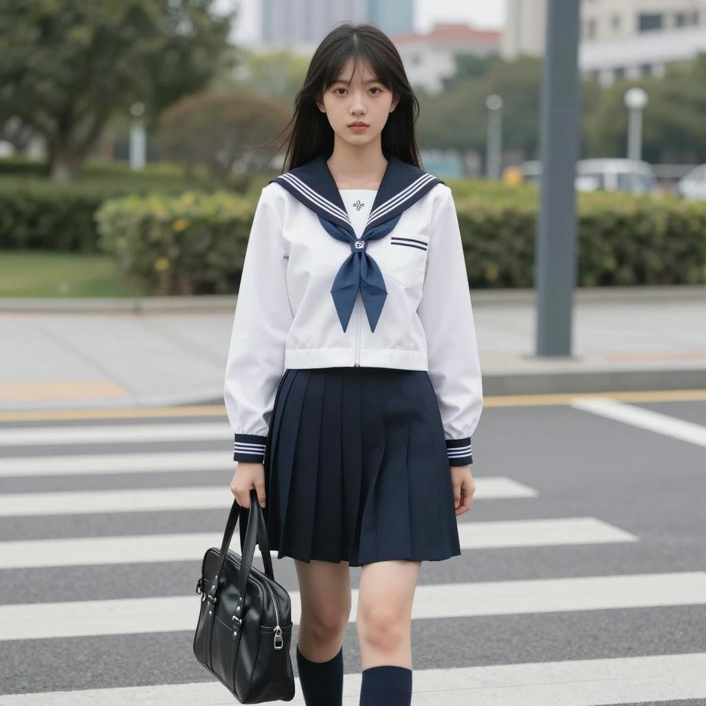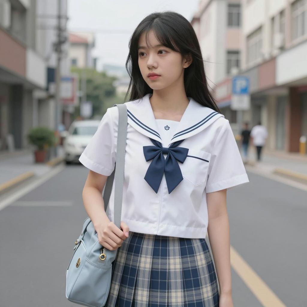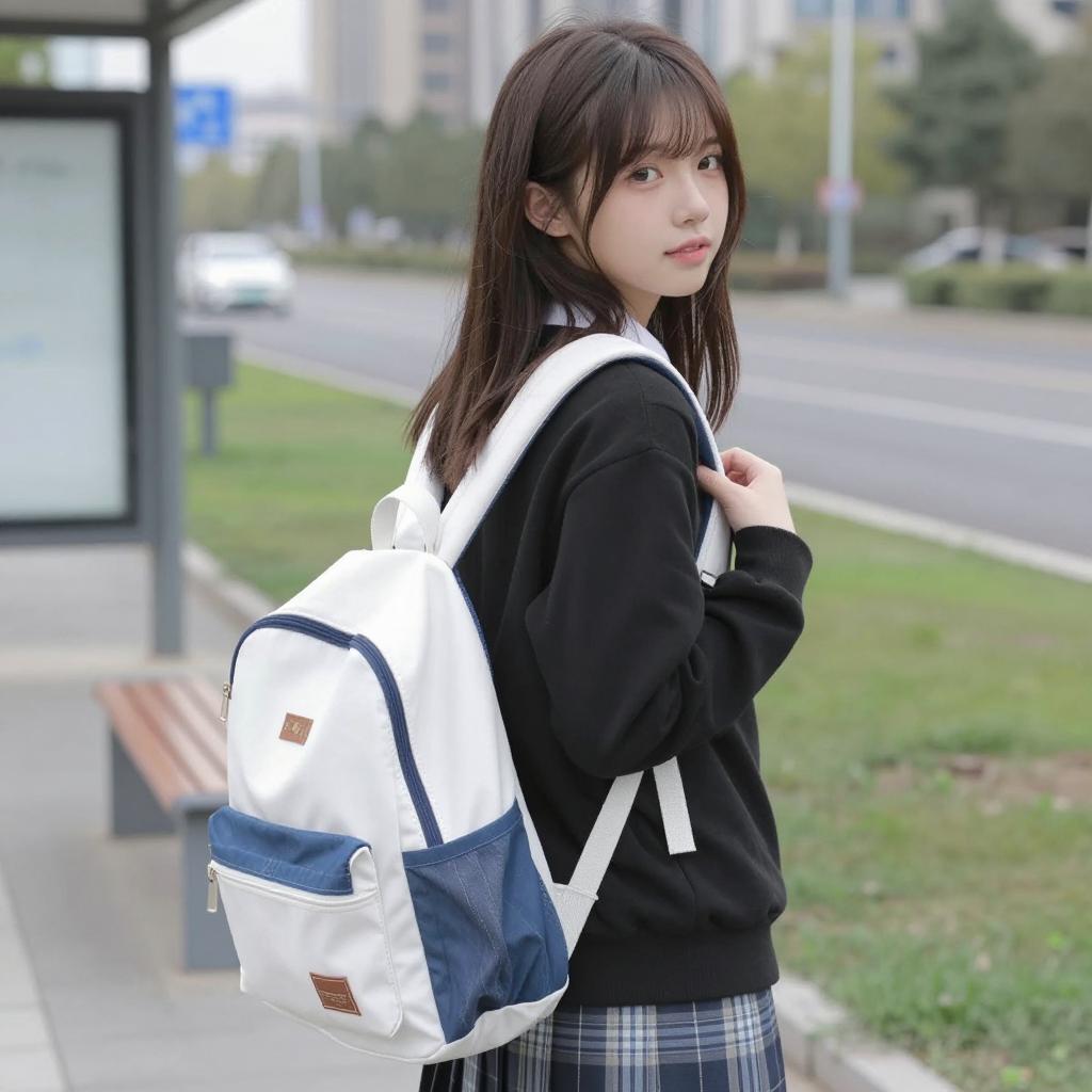 Young woman with straight brown hair and bangs, wearing a black long-sleeve shirt and blue plaid skirt, stands at a bus stop holding a blue and white backpack. She looks over her shoulder with a slight smile. Green grass and a road with buildings are in the background. Bright daylight. Photo.