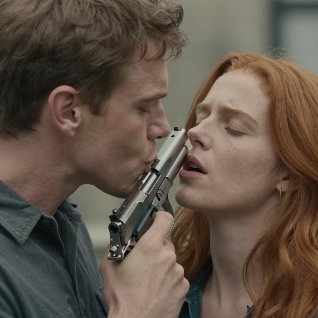 Close-up photograph of a man and a woman. The man has short brown hair, furrowed brows, and a serious expression. The woman has light skin, closed eyes, and her mouth open as if about to kiss or whisper into his ear. She wears small, gold hoop earrings. Their faces are close together. The background is blurred and light-colored. Both subjects are centered in the frame.