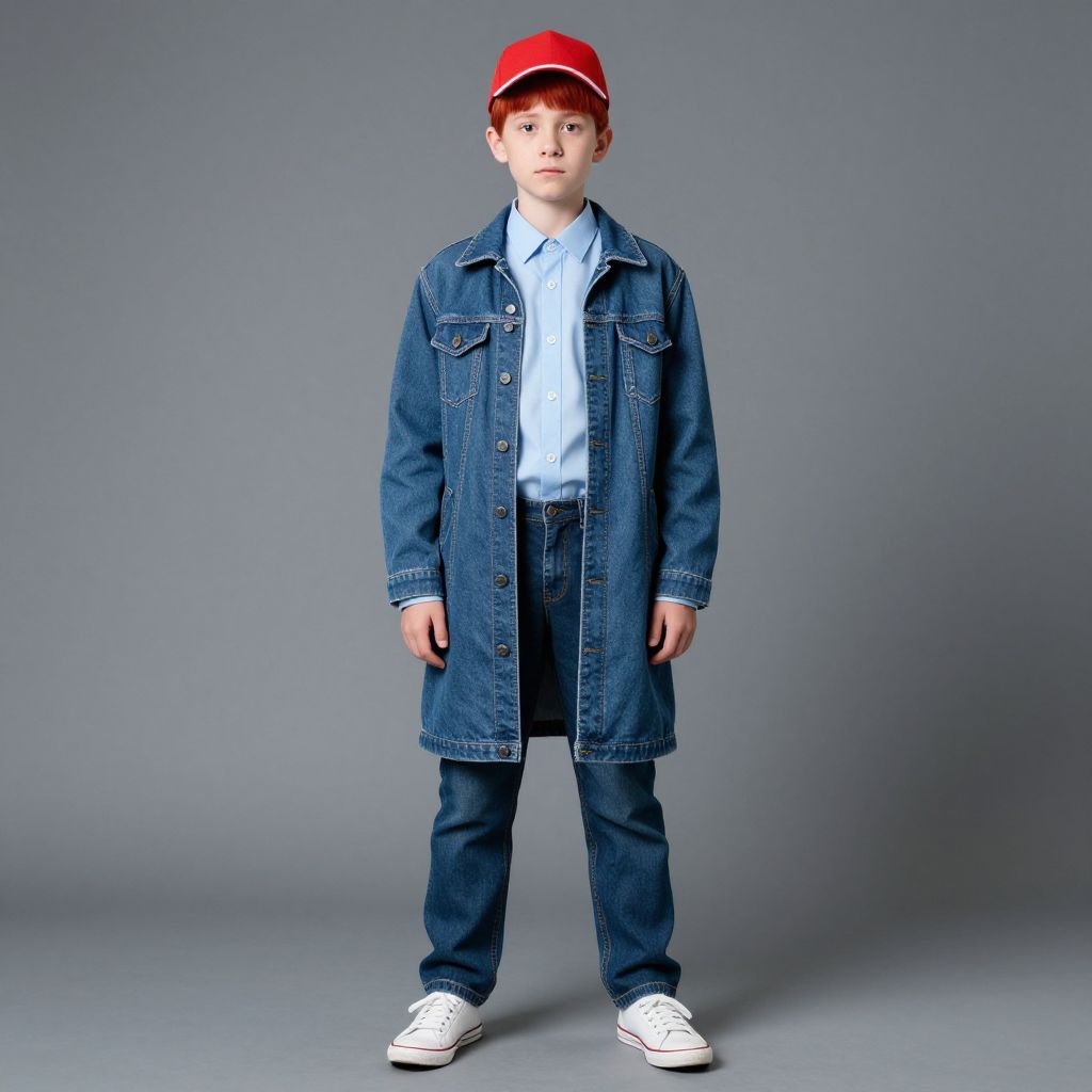 Red scientist costume, 1boy, solo, male focus, pants, shoes, sneakers, denim, coat, shirt, jeans, full body, looking at viewer, standing, red headwear, parody, blue shirt, hat, white footwear, closed mouth, long sleeves, open coat