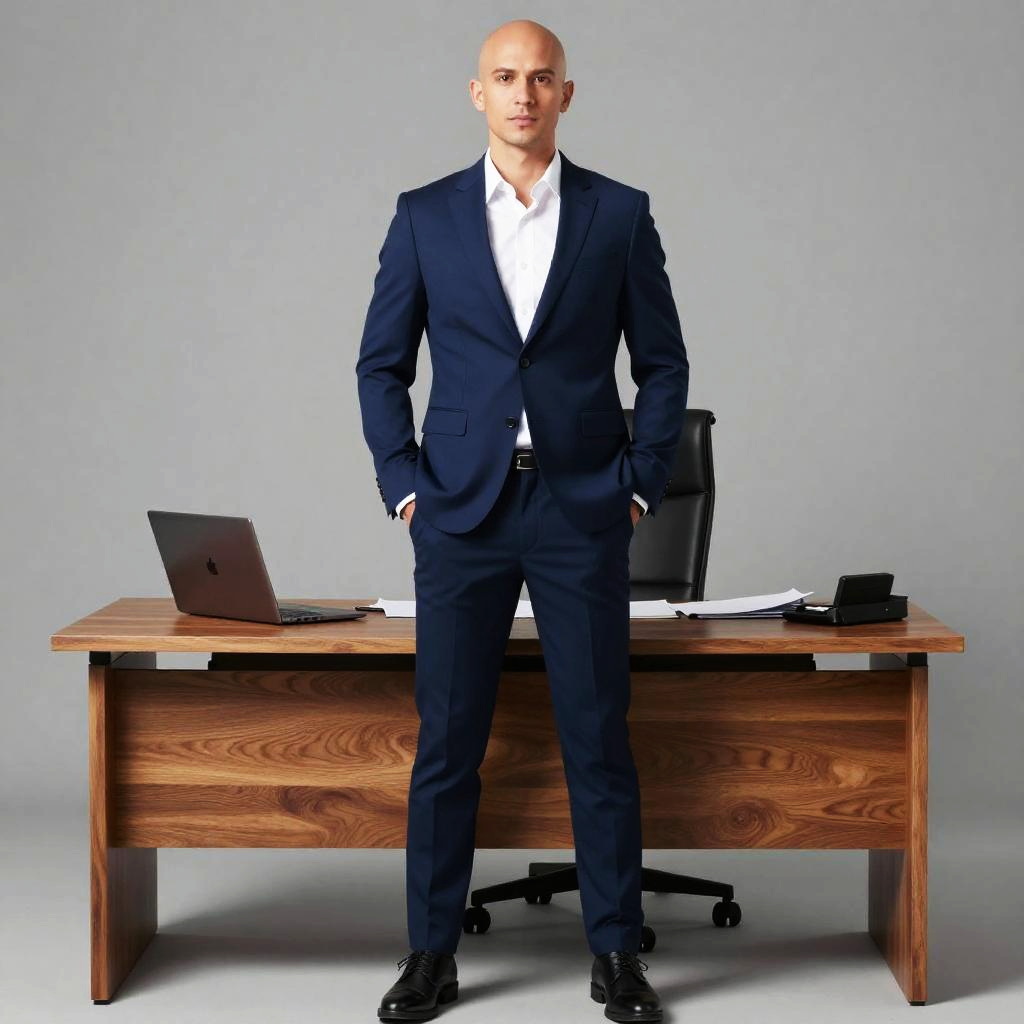 Photograph of a bald, light-skinned man standing confidently in front of a wooden desk. He's wearing a dark blue suit with a white shirt, no tie, and black shoes. His hands are in his pockets, and he's looking directly at the camera. The desk has a laptop, papers, and a black office chair is partially visible behind him. The background is a plain, gray wall.