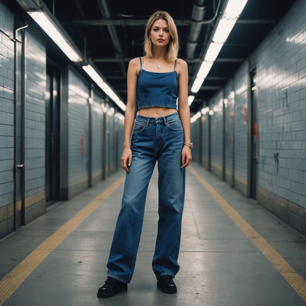 Low Rise Baggy Jeans, full-body woman, big tits, small waist, minimalist studio photograph showcasing a model with futuristic metallic makeup modeling a casual Y2K outfit. The subject wears low-cut velvet camisole with thin straps paired with loose-fitting, light-wash low-rise baggy denim jeans. The scene is an empty subway platform under fluorescent lights and clean white walls. Street style, photorealistic, 8k, detailed denim texture.