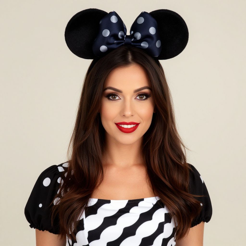 Woman Minnie Costume, woman wearing a minnie mouse ears and a black and white polka dot top