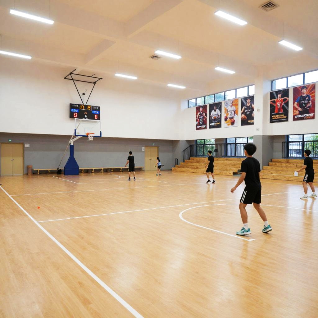 Modern school gym scene featuring a multifunctional court, digital scoreboard, bleachers, motivational posters on walls, students engaged in fitness training, airy and well-lit environment