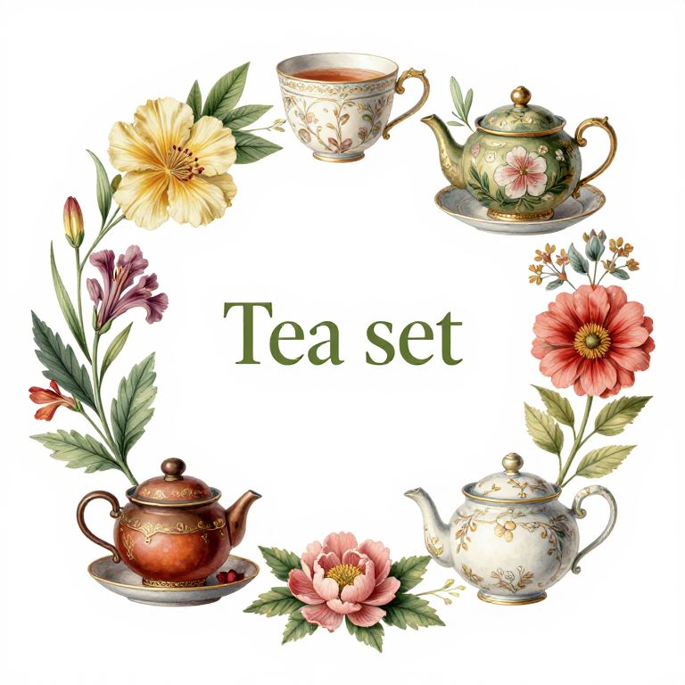 Tea Set different types of flowers in the shape of a frame around the text botanical illustration, white background, style of Pierre-Joseph Redoute,