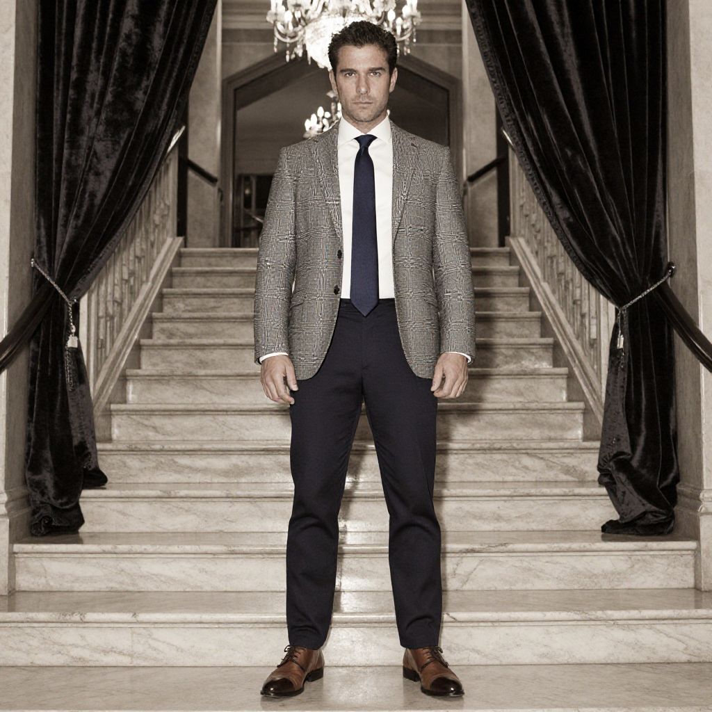A man, medium gray checkered blazer, white spread collar shirt, solid navy tie, dark navy chinos, brown leather monk strap shoes, grand marble staircase, ornate chandeliers, velvet curtains, sepia effect, confident expression Man has masculine face and piercing eyes