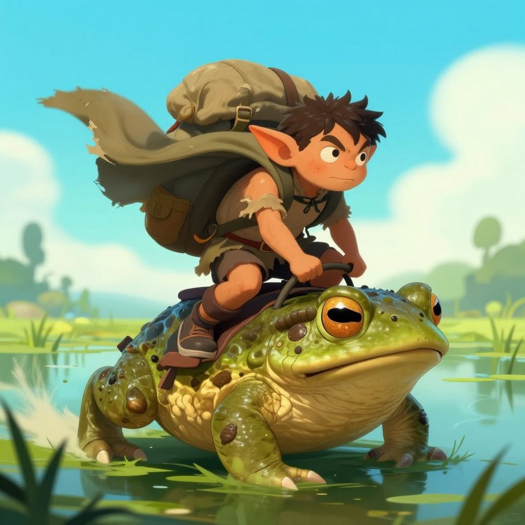 Young goblin riding a giant toad across a swampy landscape, tattered cloak fluttering, oversized backpack, adventurous vibe, bright fantasy colors, dynamic composition