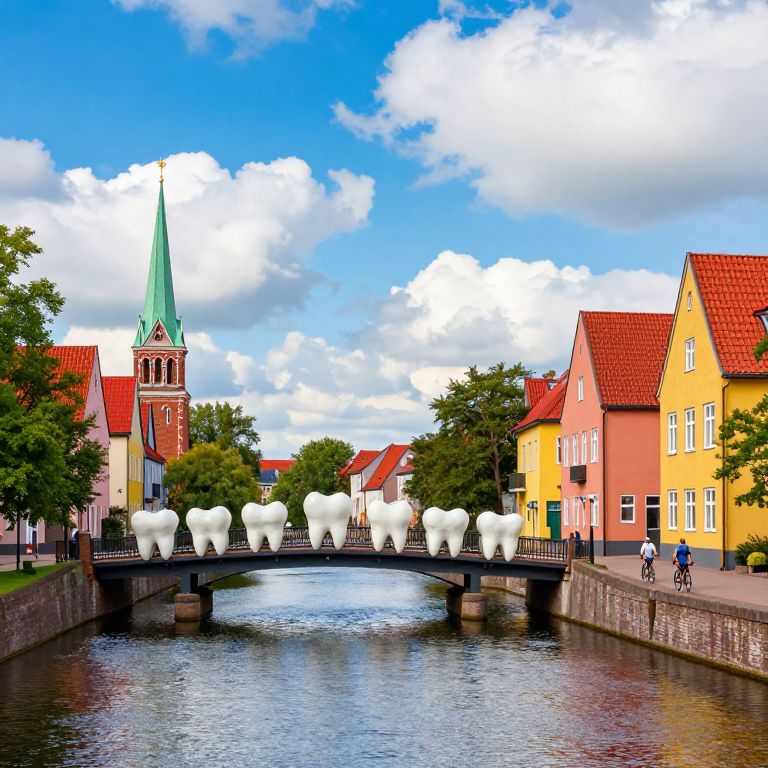 Colorful spires and red-roofed buildings frame a serene canal, where a bridge adorned with oversized tooth sculptures spans the water, while two cyclists pedal along its path beneath a vibrant sky dotted with fluffy clouds.