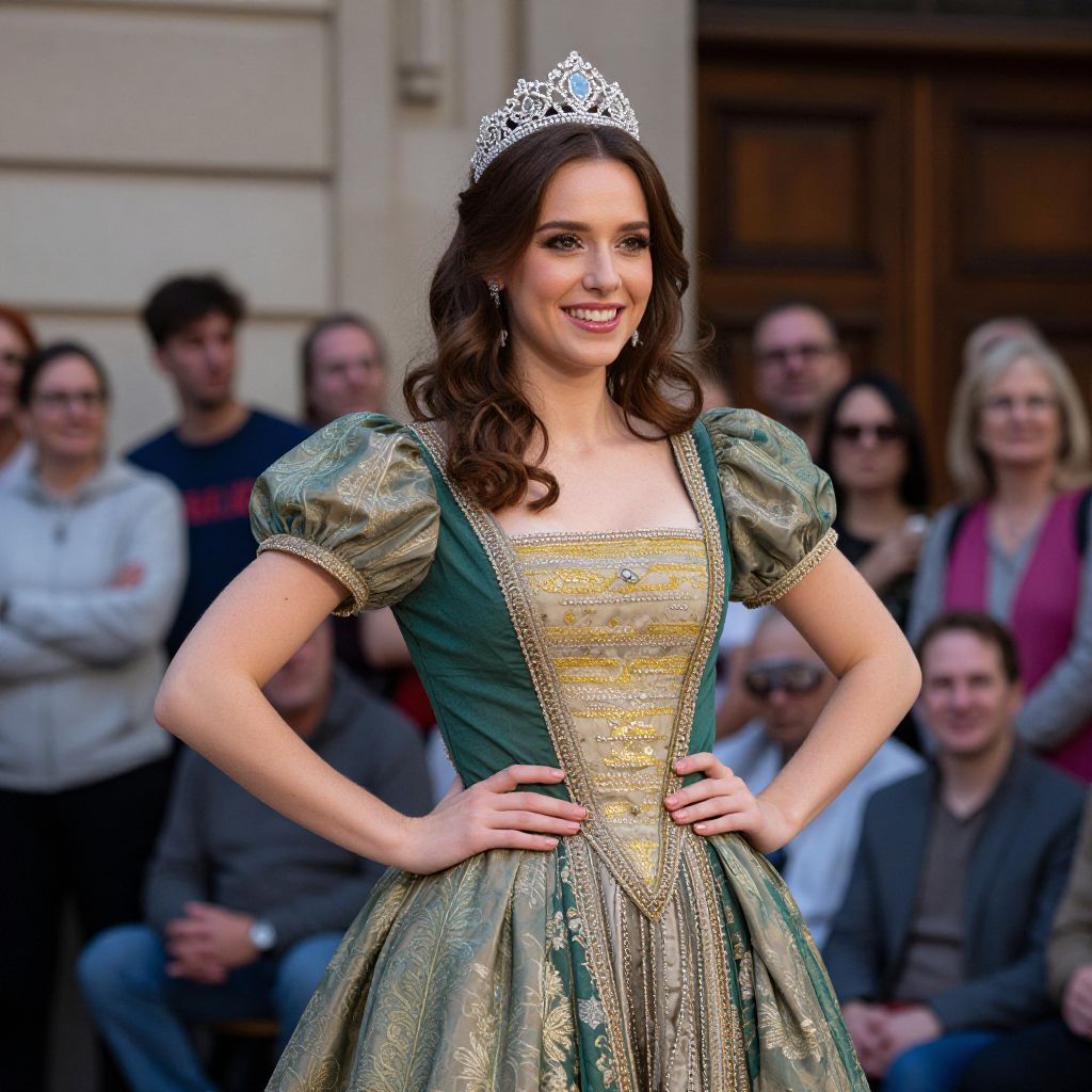 A cheerful woman in an ornate green and gold dress poses confidently with a tiara, evoking a sense of regality and performance, set against a backdrop of onlooking people.