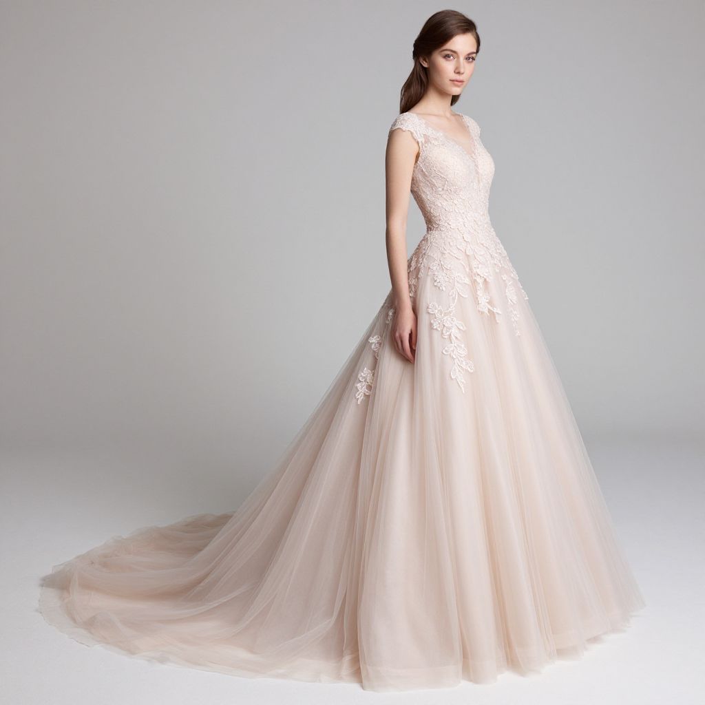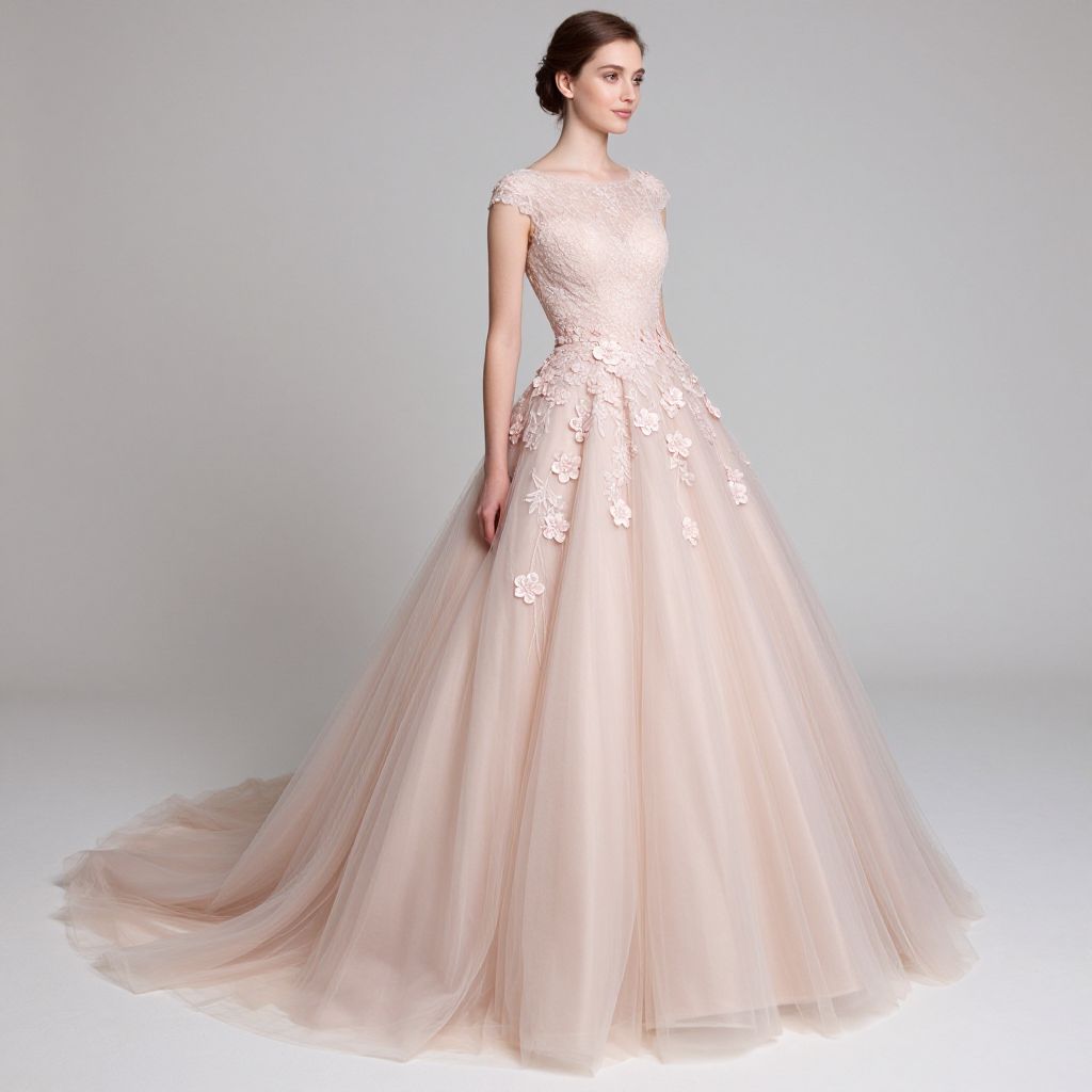 Elegant woman showcasing a luxurious ball gown with a delicate pink hue, featuring a lace bodice adorned with floral embellishments and a flowing tulle skirt trailing gracefully on the floor.