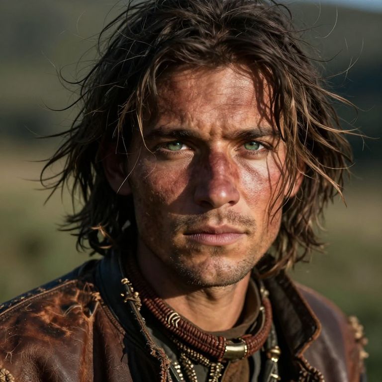 A high-resolution portrait photograph captures an enigmatic wanderer with gentle green eyes, framed by wild, wind-tousled hair. The subject's expression is a complex mix of introspection and resilience, captured from a 'worm's-eye view,' emphasizing their connection to the earth. Dramatic chiaroscuro lighting illuminates their face, accentuating antiquated features with long shadows that dance across rugged, sun-etched skin. The rich texture of their worn leather attire and hand-woven accessories speaks volumes of their life's journey. This captivating image evokes awe and empathy, drawing viewers into the wanderer's world and inviting them to share in the raw beauty and untamed spirit that defines this unforgettable individual.