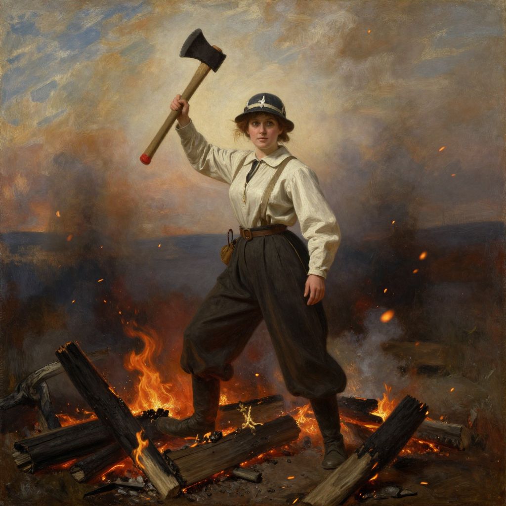 Woman in a beekeper suit, holding a fire axe in the air, standing on a pile of burnt wood and embers, flying embers out of focus, in the style of 19 th century oil painting