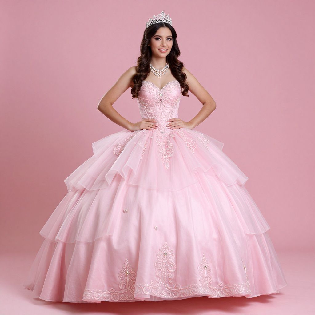 Radiant young woman wearing a stunning pink sweetheart quinceañera dress with intricate beadwork and a tiered ball gown skirt, accessorized with a sparkling tiara and pearl necklace, posing gracefully against a soft pink backdrop.