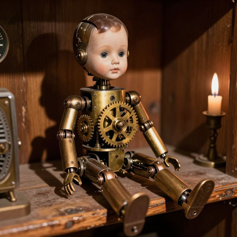 A close-up realistic shot of a clockwork doll with visible bronze mechanical joints, sitting on a weathered wooden shelf in a vintage science fiction museum, the doll's face has soft, pale skin and faintly painted eyes, its limbs articulated with precise brass gears that hum faintly in the background, ambient candlelight casting long shadows and highlighting the intricate details of the mechanical structure.