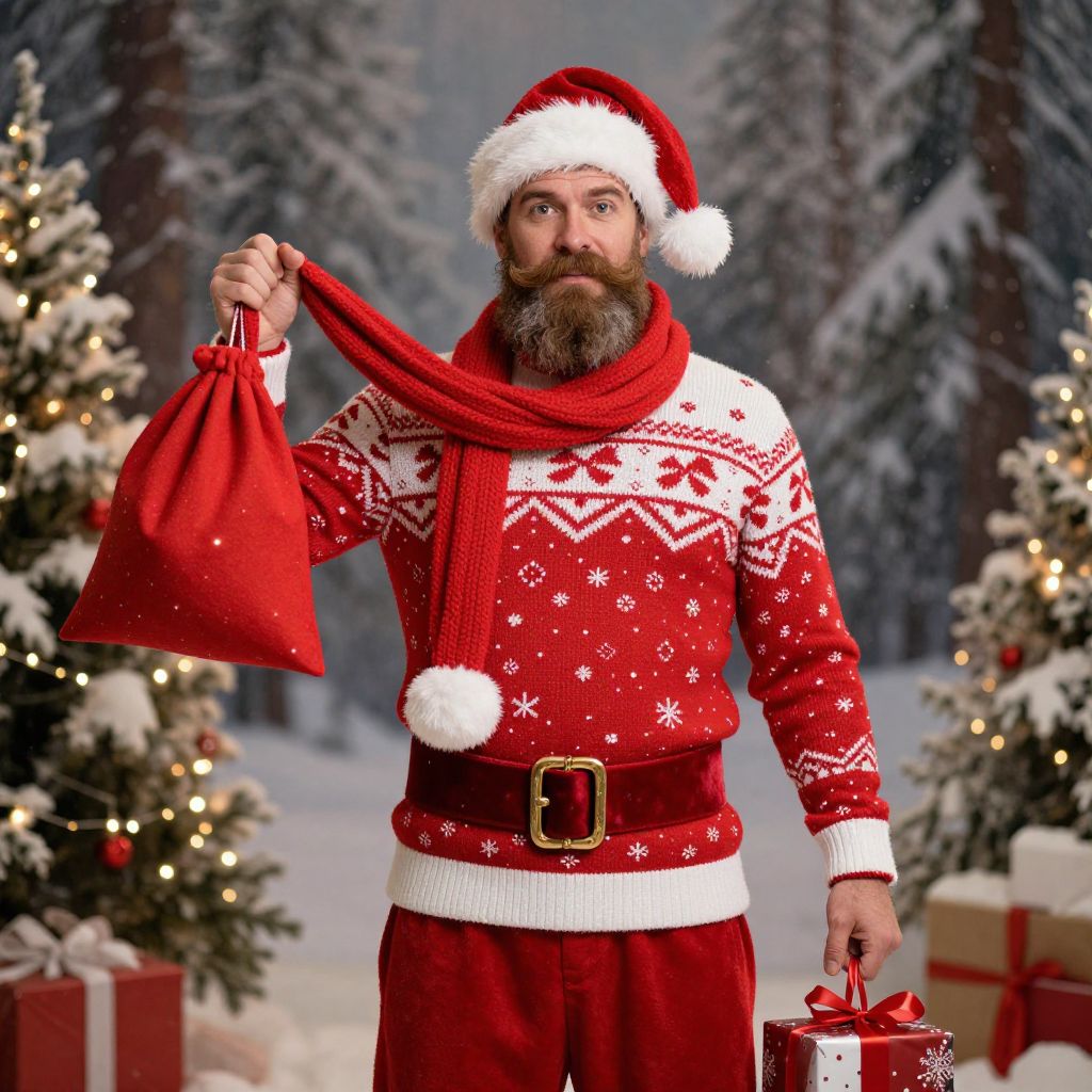 A man with a full beard and a well-groomed mustache is wearing a classic Santa Claus outfit, complete with a red and white sweater, red pants, and a red velvet belt. He stands confidently in a cozy, winter-themed setting, holding a glowing red scarf in one hand and a small bag of gifts in the other. The background features a snowy forest with twinkling lights and a festive atmosphere, adding warmth and joy to the scene.