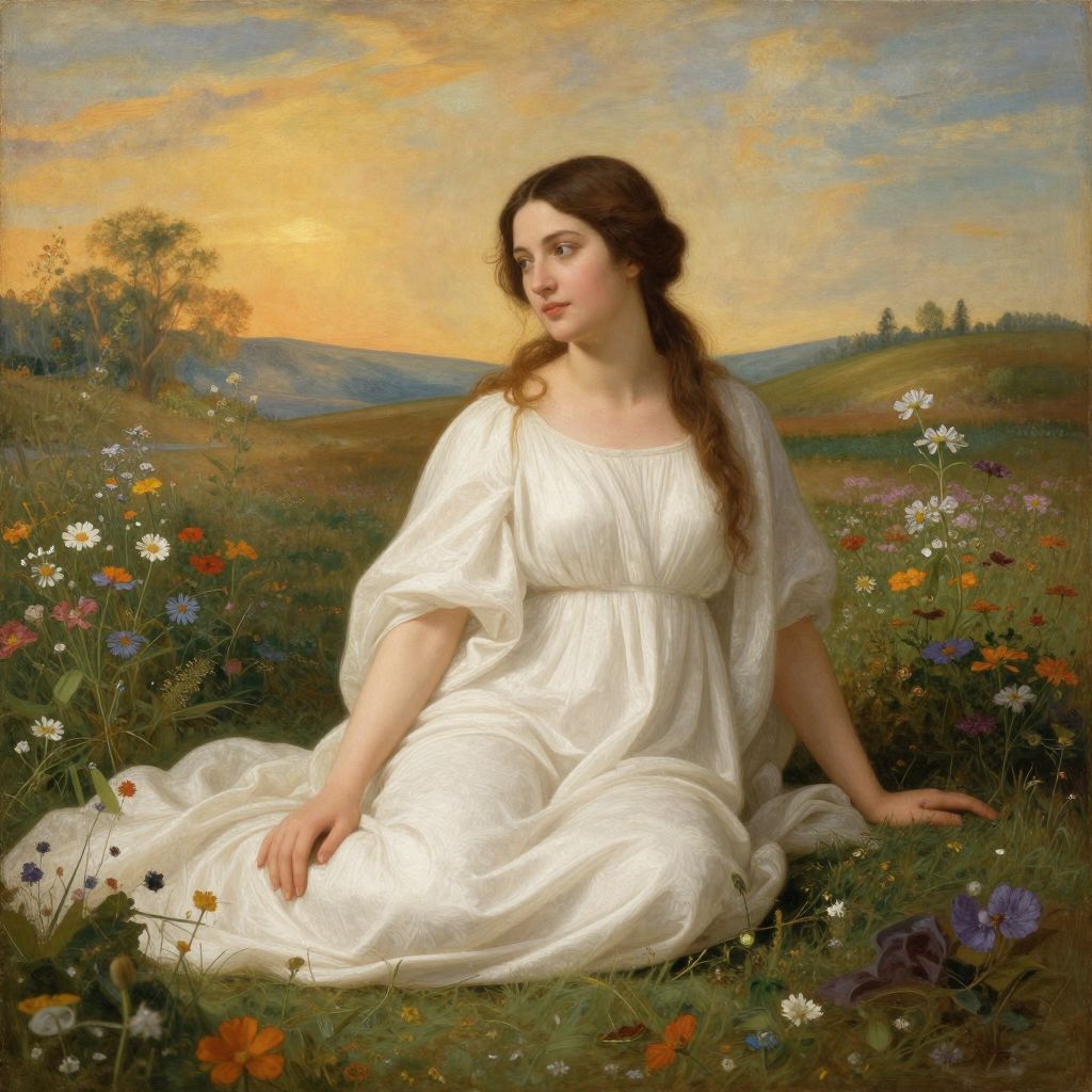 A serene digital artwork reminiscent of Renaissance portraiture, featuring a woman in a flowing white gown sitting amidst a vibrant meadow of wildflowers under a golden-hour sky, evoking the timeless elegance of \"Madonna in the Meadow\" by Raphael.
