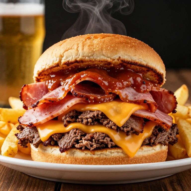Close-up of a francesinha sandwich stacked high with layers of ham, sausage and steak, smothered in thick, spicy sauce and melted cheese, vibrant colors with steam rising, garnished with a side of fries and a cold glass of beer on a wooden table