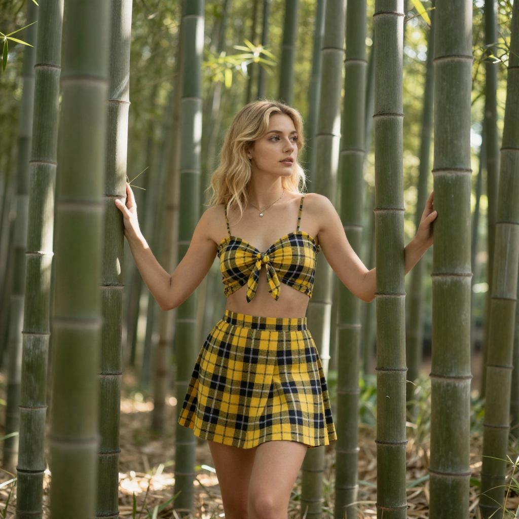 Photograph of a young woman with light blonde hair, wearing a yellow and black plaid tied-up crop top and matching skirt, standing among tall green bamboo stalks in a dense bamboo forest. She gazes to the right, her arms resting on the bamboo. Sunlight filters through the bamboo, creating a dappled light effect on the forest floor.