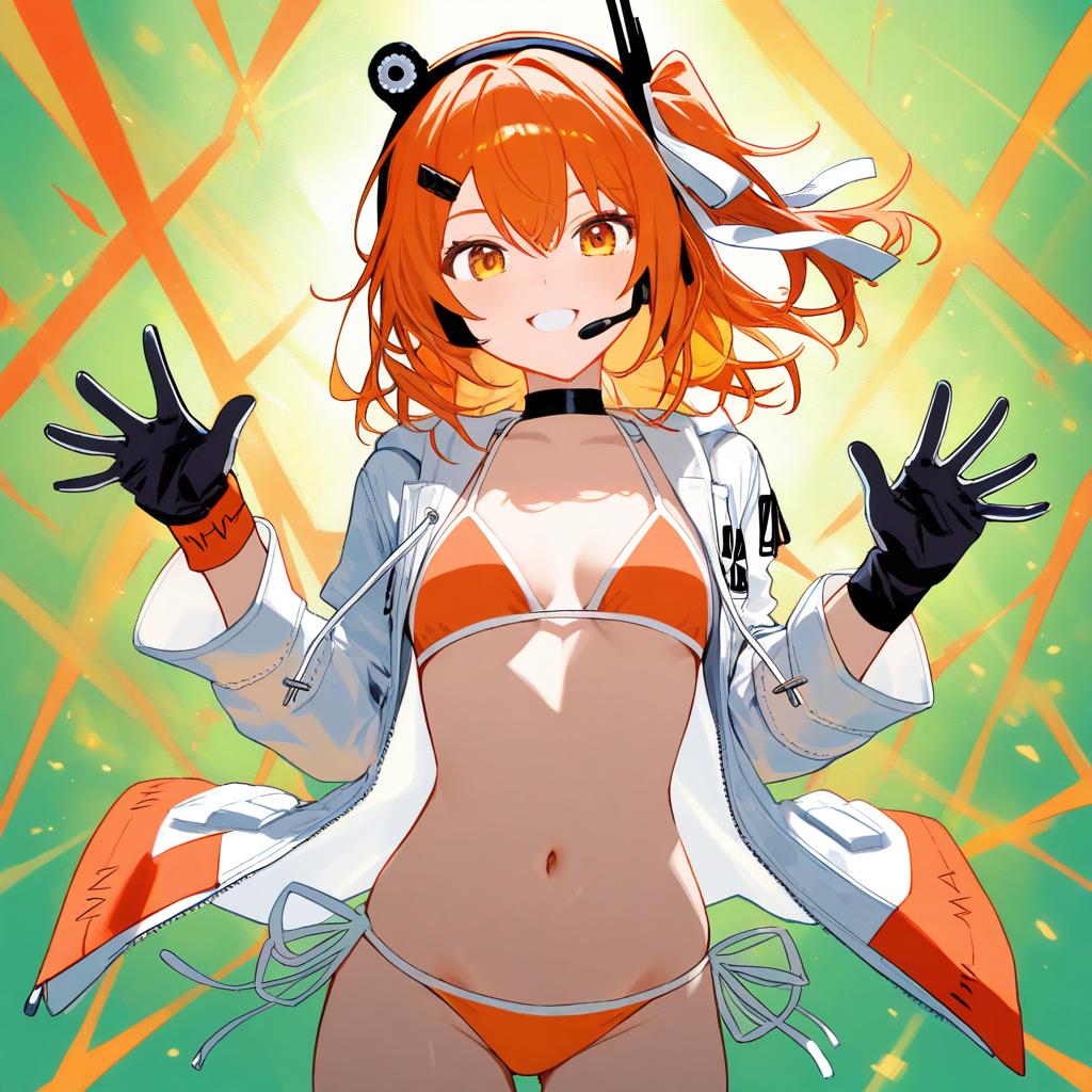 Cowboy shot, adachi rei, android, 1girl, orange hair, orange eyes, grin, striped bikini, orange bikini, side-tie bikini bottom, white jacket, open jacket, long sleeves, hooded jacket, hair ornament, hairclip, ribbon, two-tone gloves, black gloves, headset, radio antenna, looking at viewer, vibrant green background, raised hands, intense illumination, wristband clout