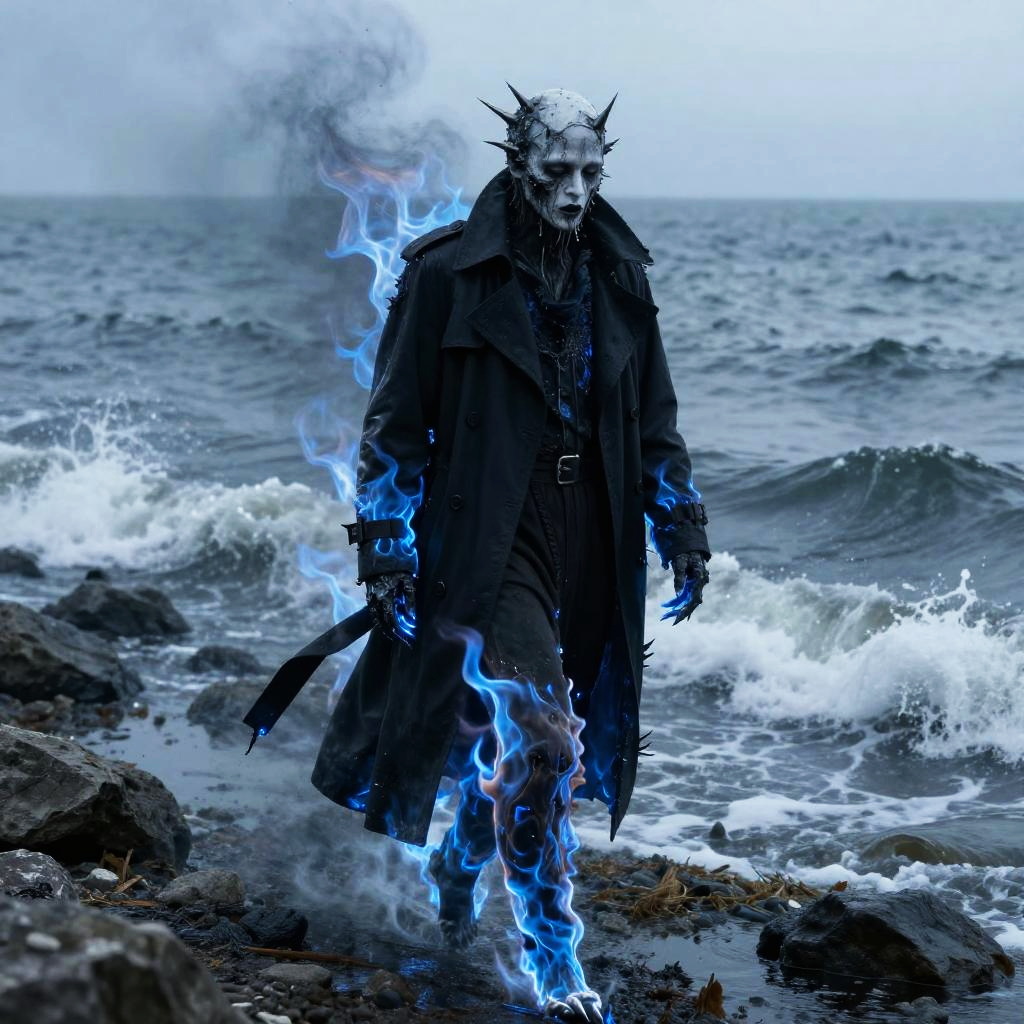 Realistic photo.A pale wraith with a worn, distorted visage resembling melted wax and jagged metallic spikes jutting out, shrouded in a long, smoldering black trench coat engulfed in ghostly blue flames, wandering in a serene lakeshore overwhelmed by cascading spectral waves. realistic photo