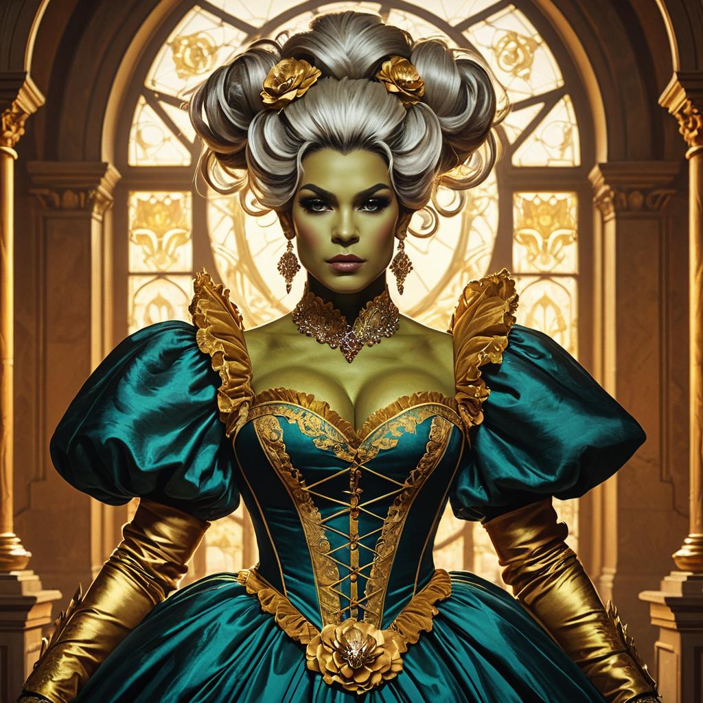 Female orc drag queen in a dazzling sequined gown, with a huge updo wig, as a fabulous D&D character. Rendered as a highly detailed digital painting with sepia effect, in the art style of Artgerm, Greg Rutkowski, and Alphonse Mucha. The composition features smooth rendering, sharp focus, and elaborate details.