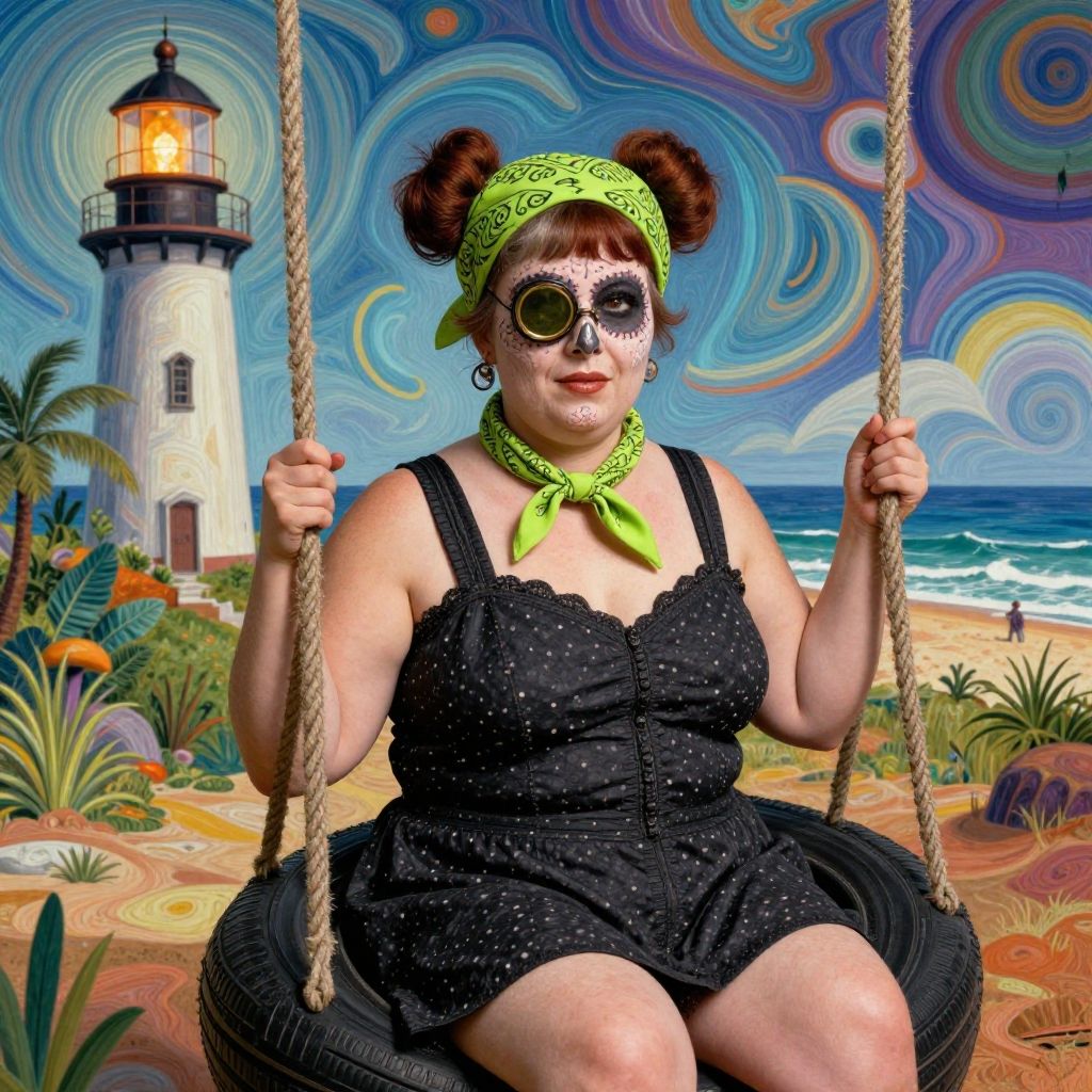 (art by Martine Johanna:1.0) and (Tanya Shatseva:0.9), portrait, award winning, concept art, close up of a plump Roman Falconer (Vikt├│ria:1.3), she is very 1940'S and Absurd, she is sitting in a Refined Tire swing, she mood is very dark, the Falconer has Space buns hair, the Falconer has a Repugnant Asian Lime green Bandanna, monocle, from inside of a Airy Lighthouse, dense beach and vegetation, Summer, Very wide view, Ultra Detailed, Hopeful, insane details, Vorticism Art, short lighting, F/1.8, three colors, Swirling, de dia los muertos, highly detailed face, photo-realistic face, artstation, trending on CGSociety