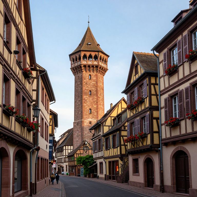 Dolder Tower stands majestically above a cobblestone street in Riquewihr, Alsace Region, France, flanked by colorful buildings with shuttered windows and punctuated by bicycles parked neatly against the walls.