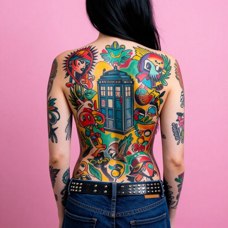 Photograph of a person with long black hair, standing against a bright pink background. Their back is fully covered in vibrant, detailed tattoos featuring a mix of colorful characters, objects, and designs, including a TARDIS and a bird. They're wearing dark blue jeans with a studded belt. The tattoos are bold and intricate, showcasing a rich, artistic style.